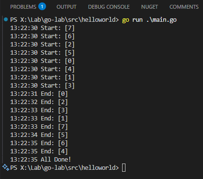 微軟 Go 教學沒提,這裡補上另一種同步化做法。若 Goroutine 執行完不需傳遞資料,則可透過 sync.WaitGroup 計數器來統計執行中的作業,例如以下的範例: