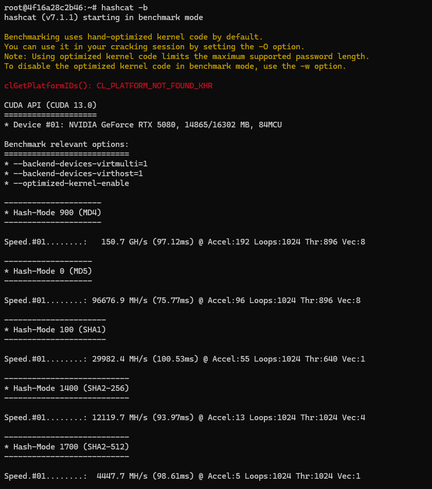 Hashcat 有個 Benchmark 功能,可以測試不同雜湊演算法的每秒執行次數。