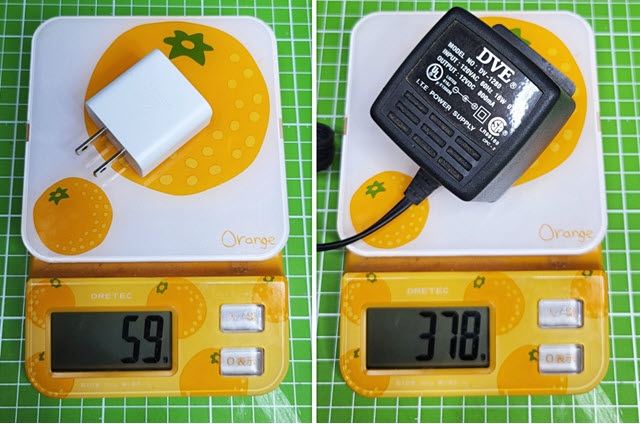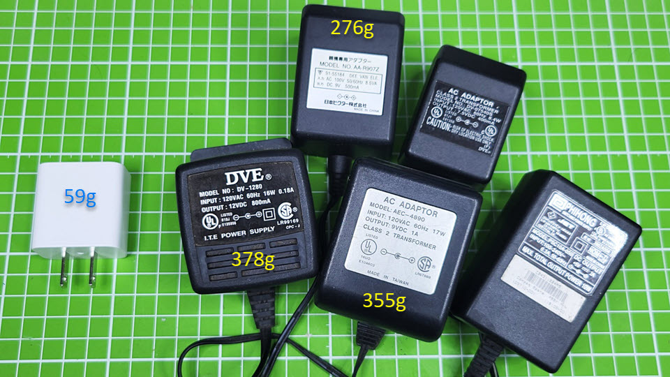 上了年紀的朋友應該對這種拳頭大小黑磚頭似的整流器不陌生。塊頭不小,電力輸出卻很一般,手邊這幾顆分別為 12V 800mA、9V 500mA、9V 1A、7.5V 400mA...。其中最重的 12V 800mA 重達 378g,相較左邊平板 Type-C 充電頭不到 60g,輸出可到 5V 3A 或 9V 2.77A,重量有六倍,輸出功率只有 1/4。(這顆 Type-C 充電頭輸出電流算大偏重,一些 5V 1A 的充電頭甚至只要 20 公克)