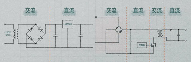 早期交流電轉直流電主要靠線圈式變壓器降壓後供電,變壓器由鐵芯和銅線圈組成,其輸出功率與體積及重量成正比,110V 轉 12V/9V 需要較多線圈匝數,一顆 10W 的線性變壓器重量約 300g 參考,這足以解釋老式整流器為何隨便都 300g 起跳。