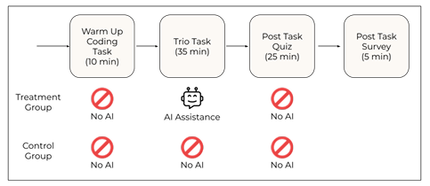 實驗設計為:所有受測者先有 10 分鐘的暖身練習,接著要在 35 分鐘內完成兩道程式設計題目(計時器實作及記錄檢索功能),最後進行一項 25 分鐘的測驗,測驗共有 14 題,包含三類:單選概念題、閱讀程式碼推理執行結果、Debug 有錯程式等,測驗過程禁止使用 AI 工具。