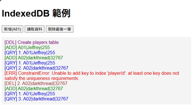 MDN 的 IndexedDB 說明文件是最好的參考來源﹐它的操作方式有點特殊,建立 IDBRequest 透過 onupgradeneeded 事件建立資料庫,IDBTransaction 物件再透過 onsuccess 事件取得查詢結果、oncomplete 事件確認動作完,錯誤處置則是靠 onerror,走一個非同步路線。我寫了一個簡單的範例包含新增、刪除、讀取,補充說明寫在註解。線上展示