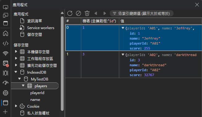 F12 開發者工具有 IndexedDB 資料檢視器,挺方便的。