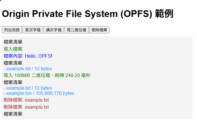 <h1>Origin Private File System (OPFS) 範例</h1>