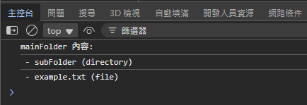 當然,OPFS 也支援子資料夾結構,列舉項目時,可由 kind == 'file' 或 'directory' 判斷是目錄還是檔案:
