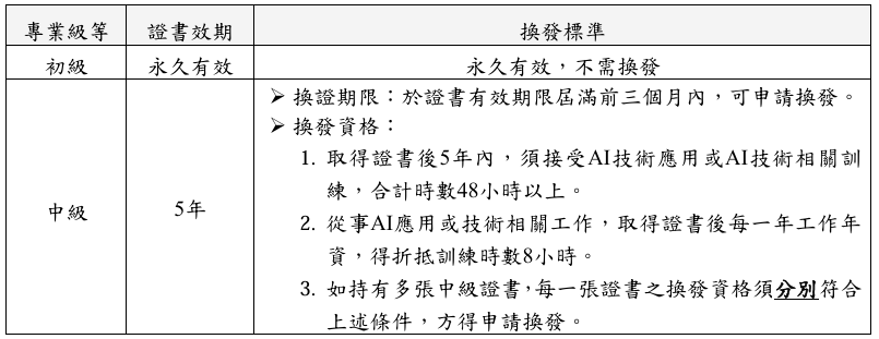 - 初級重點在人工智慧基礎概念、資料處理、機器學習原理,以及生成式AI應用與規劃,適合非資工背景、行政與企劃職等入門者。