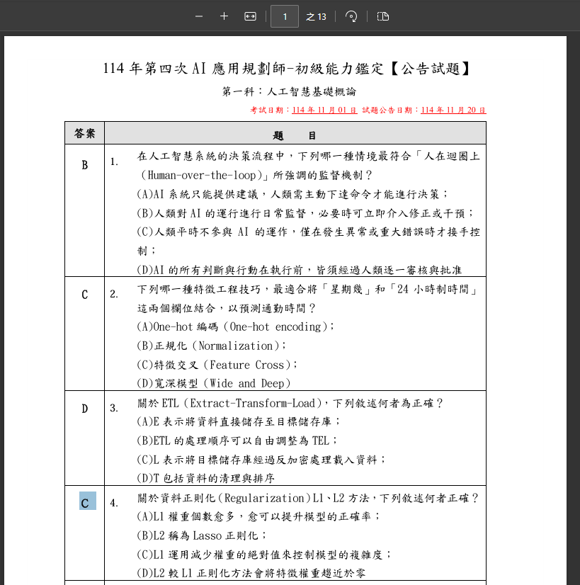 初級的考題不難,但如果你只會用 AI 工具,例如:擅長用 GPT 寫報告回信、精通 Gemini 生圖表做簡報、甚至是 Vibe Coding 大師,對 AI 原理或理論沒有基礎,能通過初級考試的機率不高。但只要有基礎,對相關名詞都有一定了解,則要考過就不是件難事。以 114 年的考古題為例,有些題目即便出現從沒看過的鬼東西,但若知道術語如 One-Shot 編碼、LSTM、可解釋性...,了解它們的意義,還是有很高的機率猜對。