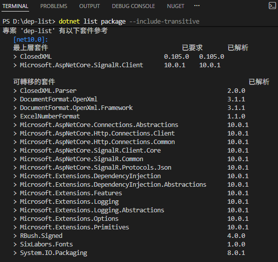 好消息是 .NET CLI 已內建相關功能,用 dotnet list package --include-transitive,--list-transitive 即可列出所有用到的套件,包含依賴套件。