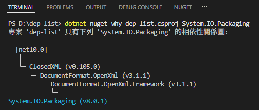 這個清單真的包含依賴套件再延伸出去的依賴套件嗎?有個 dotnet nuget why <csproj name> <package name> 指令可以驗證這點,它會追蹤專案與特定套件的依賴關係是如何發生的。以文章開始舉的 System.IO.Packaging 為例,查出的關聯即先前的描述的依賴層級一致: