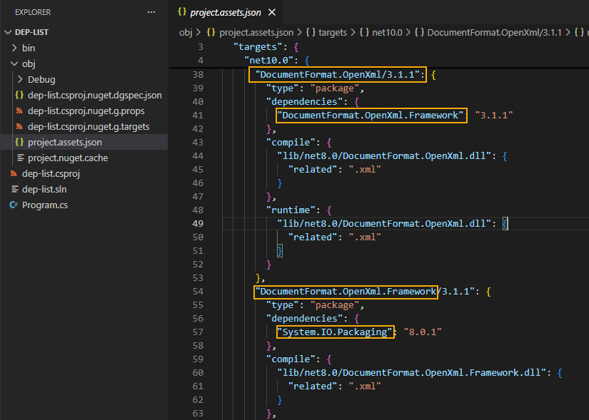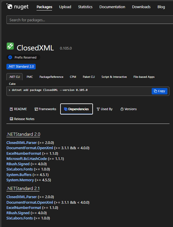 NuGet 套件間常存在依賴關係,例如:ClosedXML 0.105.0 需要 DocumentFormat.OpenXml (>= 3.1.1 && < 4.0.0),而 DocumentFormat.OpenXml 需要 DocumentFormat.OpenXml.Framework (>= 3.3.0),DocumentFormat.OpenXml.Framework 又需要 System.IO.Packaging (>= 8.0.1)。