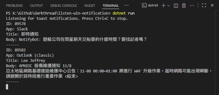 前一篇提到寫程式發送 Windows 快顯通知,我想到的另一個應用方向是寫程式去監測快顯通知。