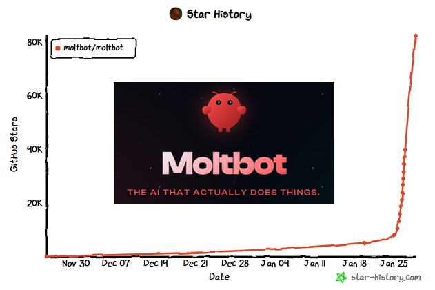 這兩天一個名為 Moltbot 的 AI 助理開源專案在網路上爆紅 (原名 Clawdbot,因發音與 Anthropic 的 Claude 相近,Logo 也與 Claude Code 相近,被迫改名),短短一個月內的時間,從默默無聞 Github 星星數一舉衝破 8 萬 (2026-01-28 數字)!