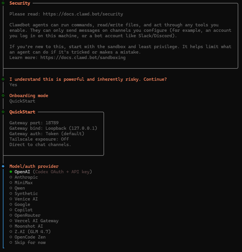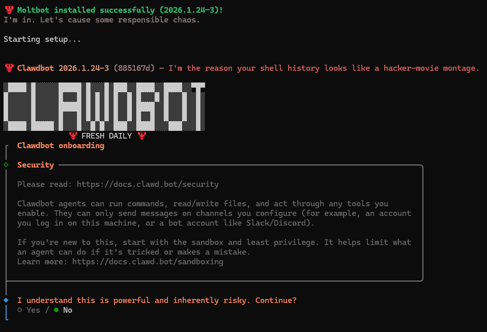 安裝前的警語不知大家有沒有讀?Moltbot 能跑程式讀寫檔案,用你的帳號發訊息,全權代表你,這點超強大也他 X 的危險,請確定你了解這點,歡喜做甘願受~ 啾咪!