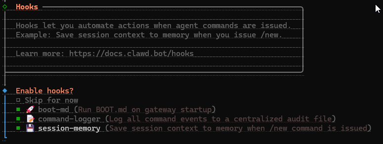 Moltbot 有所謂的 Hook (事件),預設有三個,一個是用 BOOT.md 指定 Gateway 啟動時固定執行的作業、一個用來記錄所有 AI 執行動作方便稽查(~/.clawdbot/logs/commands.log),一個是管理會話內容,都很實用且重要,建議全裝。