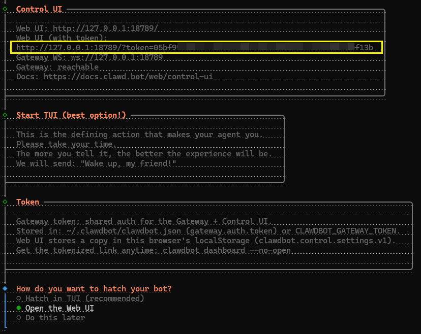 設定完成後,Gateway 會在本機的 18789 Port 執行,操作介面有終端聊天介面 TUI (Terminal User Interface) 與網頁介面兩種選擇,網頁介面比較友善。第一次開啟要帶入 Token 參數(上圖黃框),預設網站只能在本機用 http://127.0.0.1:18789 檢視,若 VM 在雲端,可用 SSH Tunneling 技巧 ssh -N -L 18789:127.0.0.1:18789 <user-name>@<remote-host> 將 18789 Port 導回本機 127.0.0.1 上。