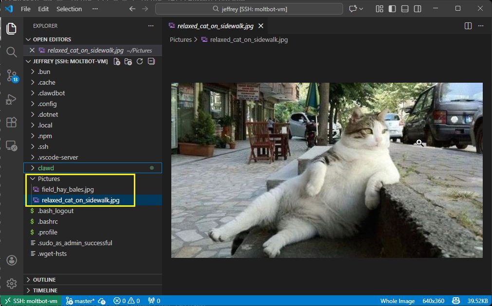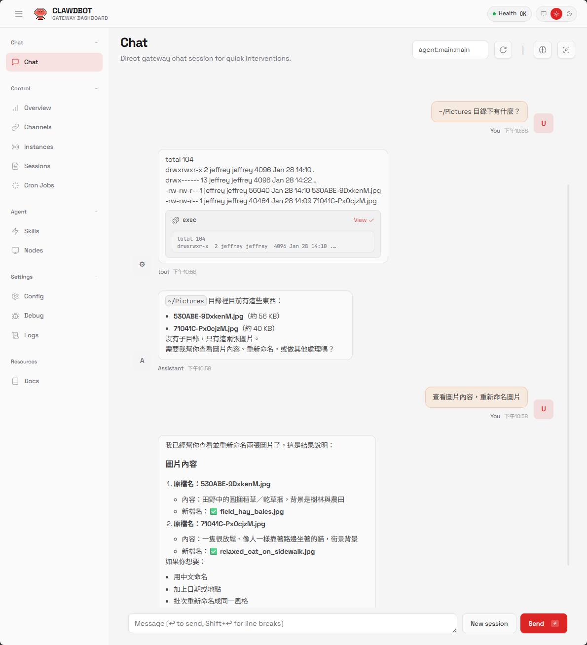 我在 ~/Pictures 放了兩張照片,請 Moltbot 用 AI 分析圖片內容,把原有雜湊碼檔名換成有意義的檔名。Moltbot 可以查資料夾讀檔案,GPT 5.2 是多模態模型能處理圖文,這個任務是塊小蛋糕,小龍蝦用後腳就能完成。