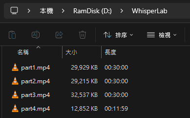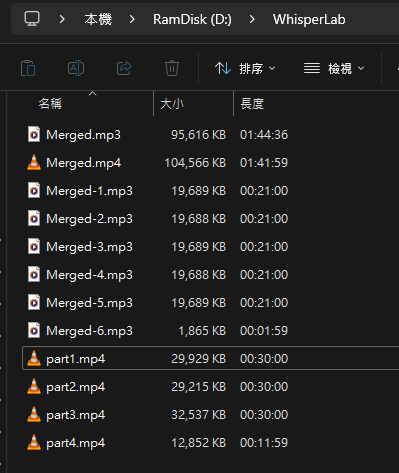 - Whisper 有單檔 25MB 限制,以 20 分鐘為單位將 .mp3 拆成多個檔案