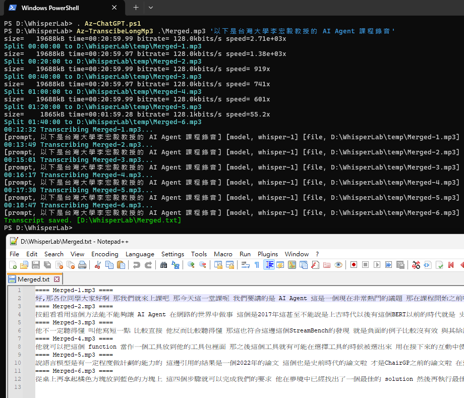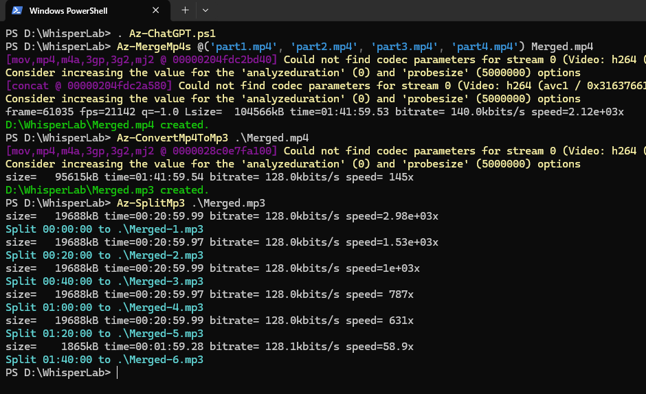 為此,我寫了三個函式:Az-MergeMp4s、Az-ConvertMp4ToMp3、Az-SplitMp3、Az-TranscibeLongMp3,程式邏輯不難,說穿了就是組裝好參數,召喚 ffmpeg 登場大顯神威罷了。只有幾個小地方值得一提: