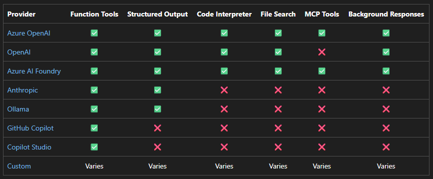 - Structured Output - 模型在呼叫工具時,產生結構化的 JSON/物件輸出,框架將其轉成型別安全的結果