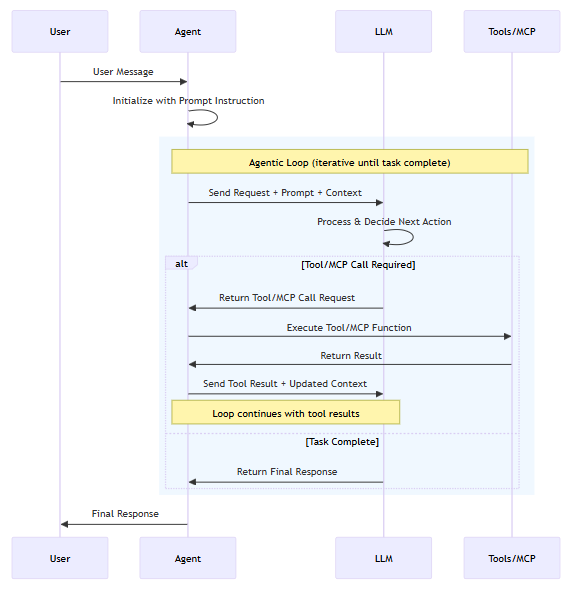 Agent 的核心運作概念如下圖 來源,Agent 在接獲使用者訊息後送交 LLM 處理,必要時會呼叫 Tools/MCP (以及 Skills),將 Tools/MCP/Skills 回傳結果及更新後的上下文送交 LLM,必要時會以迴圈方式循環多次(可反覆檢查結果、修正再執行到預合預期目標為止,經此功能加持,Agent 在一次問答間完成複雜度很高的任務),LLM 判定達標再返回最終回覆: