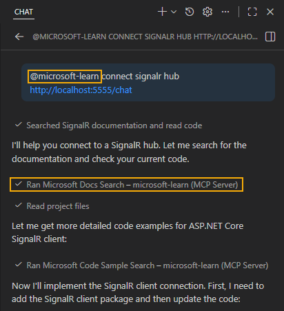 註:或更進一步明確提示 microsoft_docs_dearch microsoft_code_sample_search 等工具名稱搜尋文件庫或範例程式庫