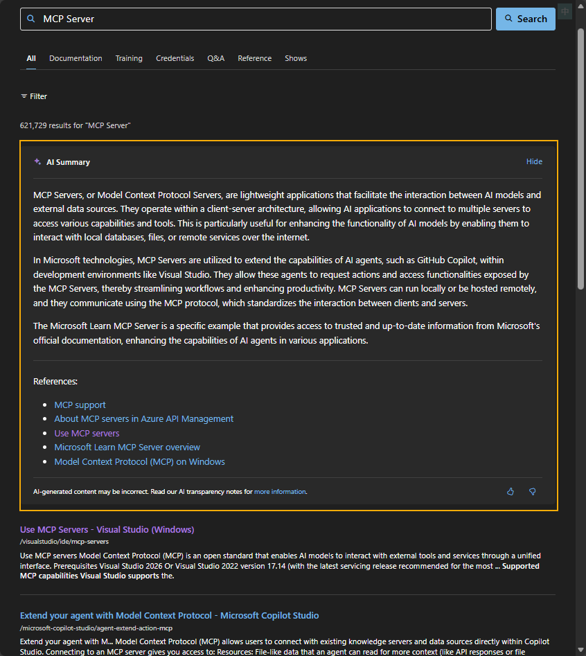 最近發現 MS Learn 也加入了 AI 功能,搜尋資料時會跟 Google 一樣多出 AI Summary:
