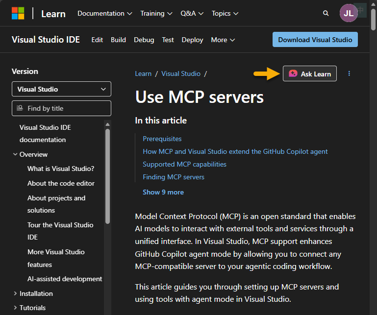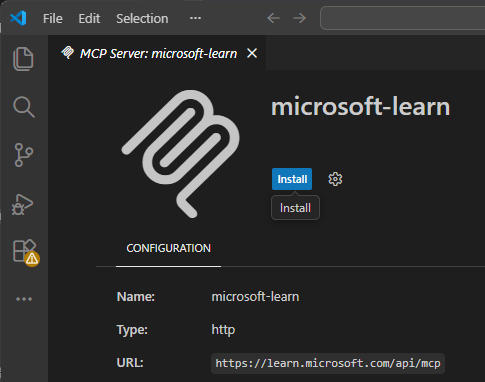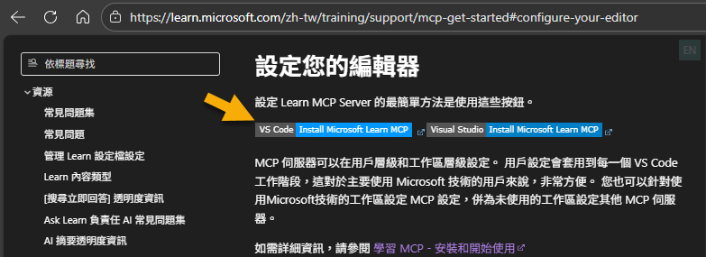 MS Learn 文件 有 VSCode 及 VS 的安裝連結。(或在 VSCode Extensions 輸入 @mcp learn)
