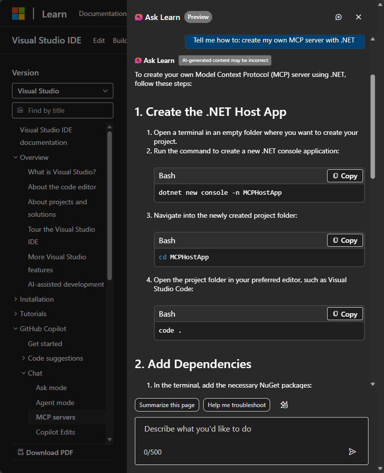 雖然 MS Learn MCP 沒實作參與者 API,但實測發現寫 @micorsoft-learn 也有不錯提示效果,比口語描述簡潔:(延伸閱讀:Github Copilot 聊天視窗指令整理)