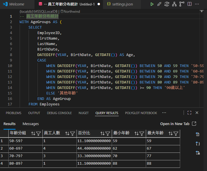下了簡單的 SELECT * FROM Employees,在 Copilot 視窗發問 依年齡為 Employee 分群 結果卻讓人小失望,AI 只依據常識回答,並沒有深入了解我的 Employee 資料表結構提供解答。