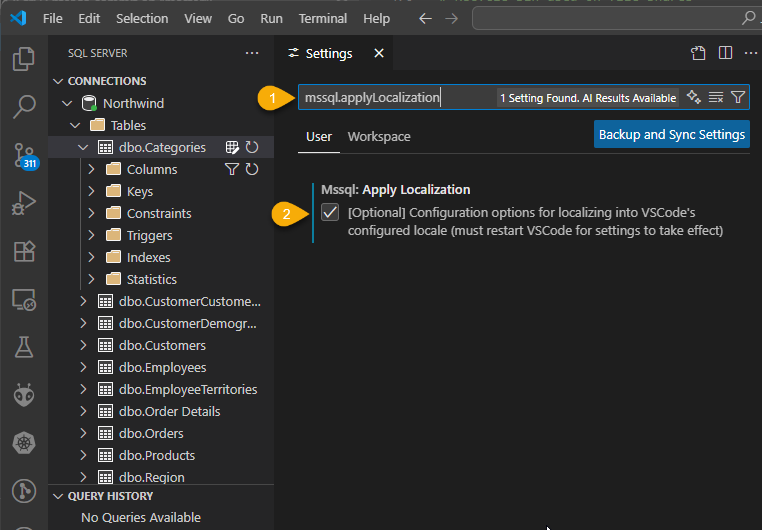 這裡有個小問題是,我的 VSCode 顯示語系設成英文,但 MSSQL 擴充套件介面硬要顯示中文,看起來很不習慣。查到這是個 Issue,解法是勾選 Mssql: Apply Localization 設定修正: