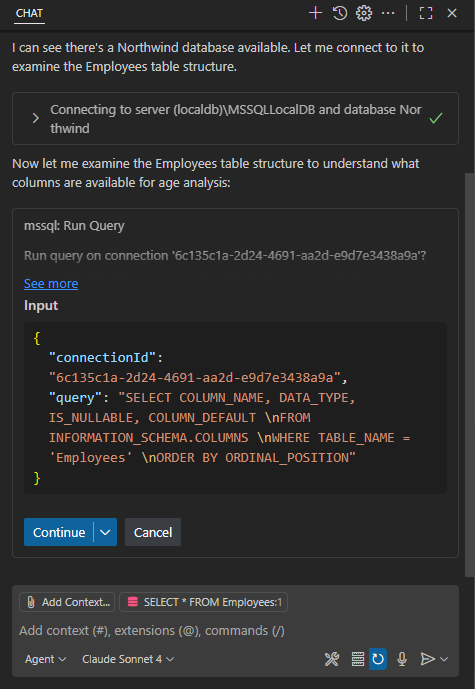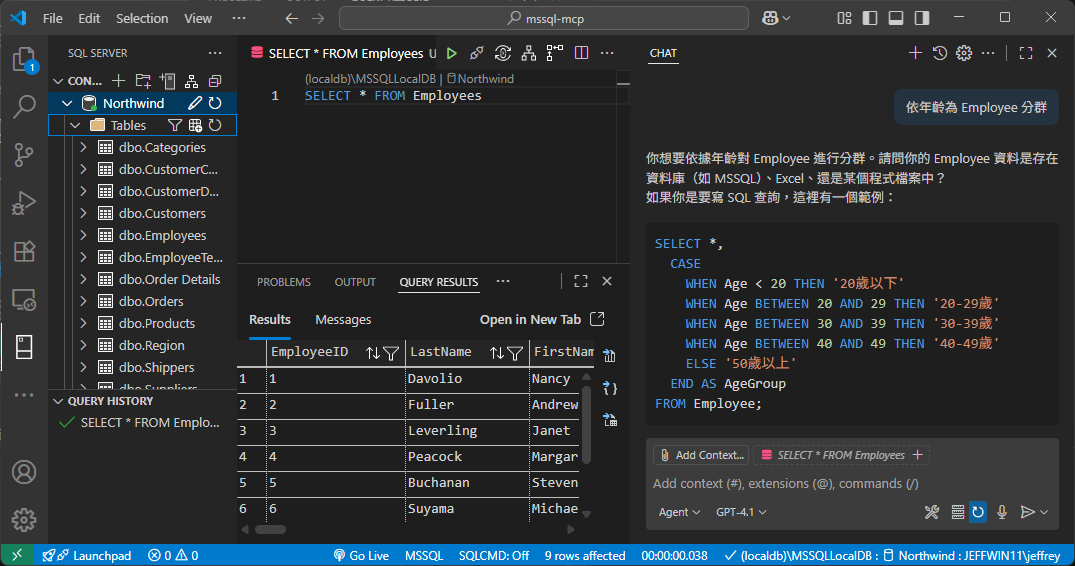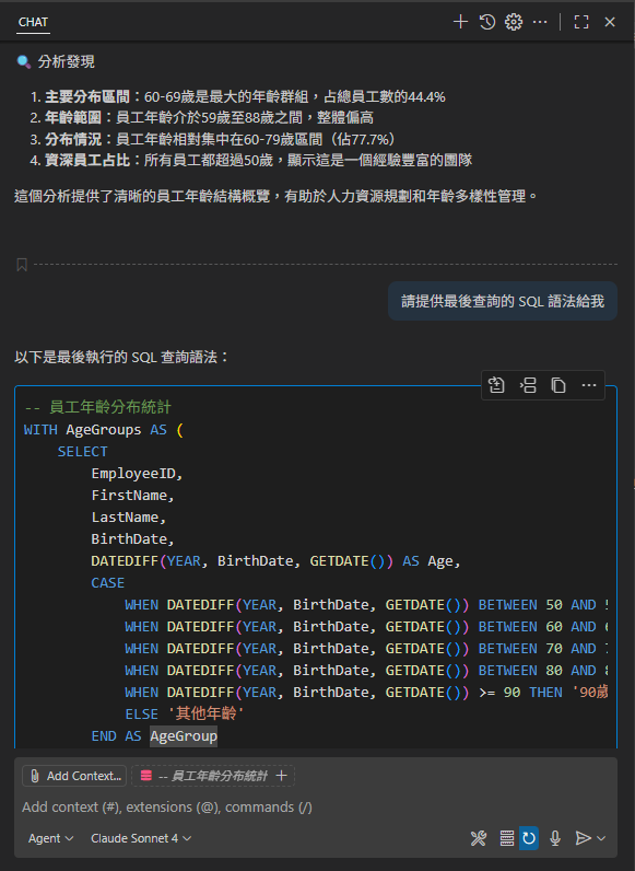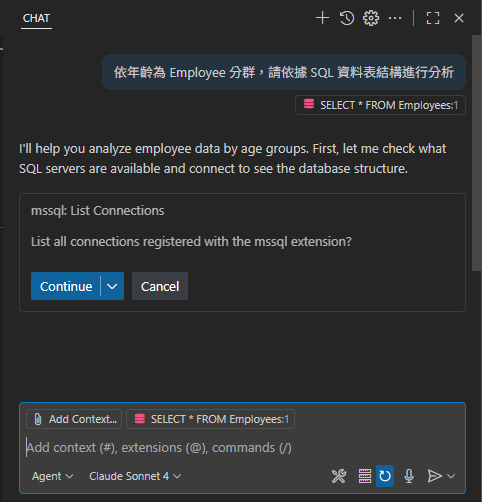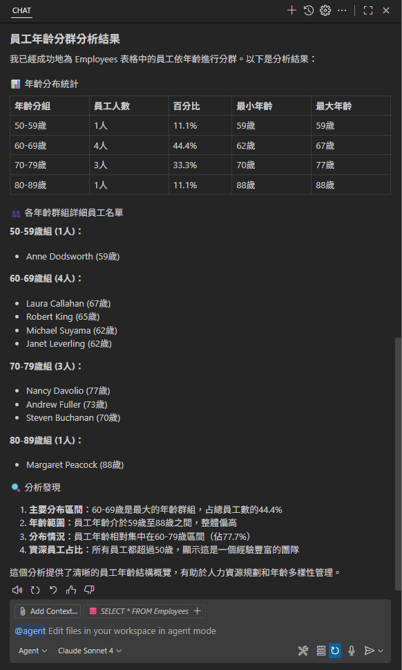 照理來說,Agent Mode 會自行依據當下情境判斷要調用什麼工具,調用工具與否跟使用的模型 (GPT-4.1、Claude Sonnet 4...) 也有關係,換個提示 依年齡為 Employee 分群,請依據 SQL 資料表結構進行分析再改用 Sonnet 4,結果就不同了: