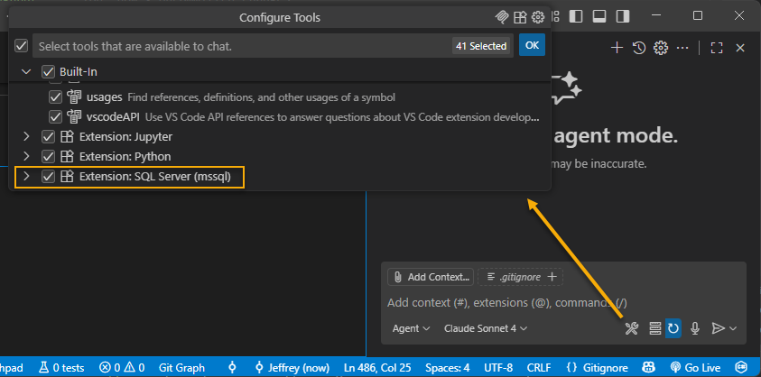 點一下 Agent Mode 下方工具列的小扳手圖示,確認 SQL Server (mssql) 已在工具清單中,但沒被調用。