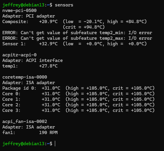 原本以為我買的小主機是無風扇設計,裝機後聽到細微風扇聲,後來發現這款只有兩個型號無風扇,我買的型號是有風扇的。實測日常負載,風扇轉速維持在 200 RPM 上下幾乎無聲,CPU 溫度 31 度。嚴格來說,我想這台不裝風扇也 OK,頂多溫度高個幾度。無風扇款的硬體規格相同,猜想就是用略高的溫度去換減少積塵跟完全無聲吧。