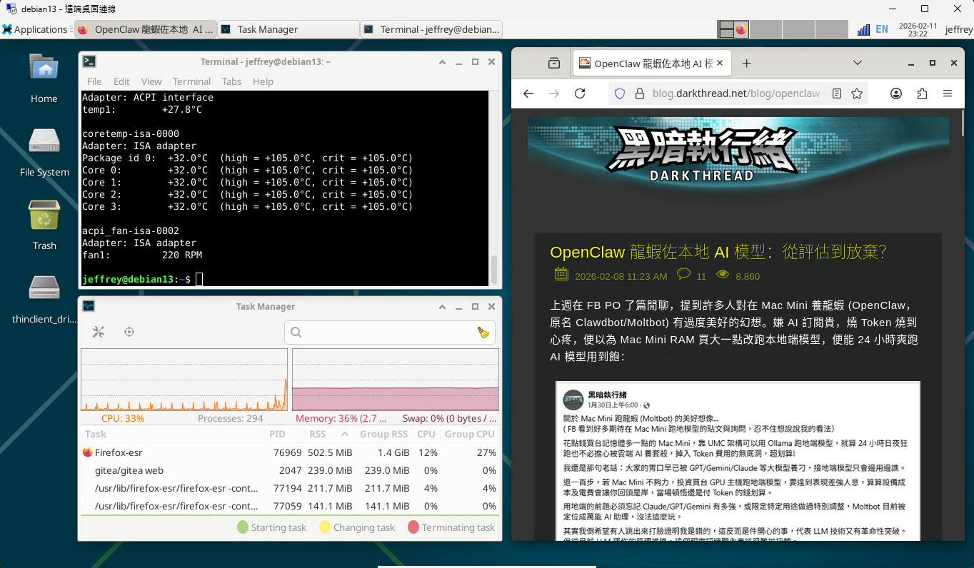 新主機有 8G RAM,記憶體寬裕不少,因此我沒停用 xfce 桌面環境,還順便裝了 xrdp,偶爾可從 Windows 遠端登入感受 Linux 的 GUI 操作體驗也不錯:(桌面環境果然較耗資源,Firebox 就吃了 500MB+)