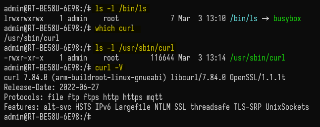 但 curl 並不屬於 BusyBox,是另外安裝的執行檔,其版本為 7.84.0 (arm-buildroot-linux-gnueabi):
