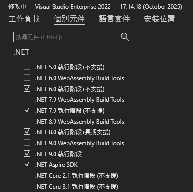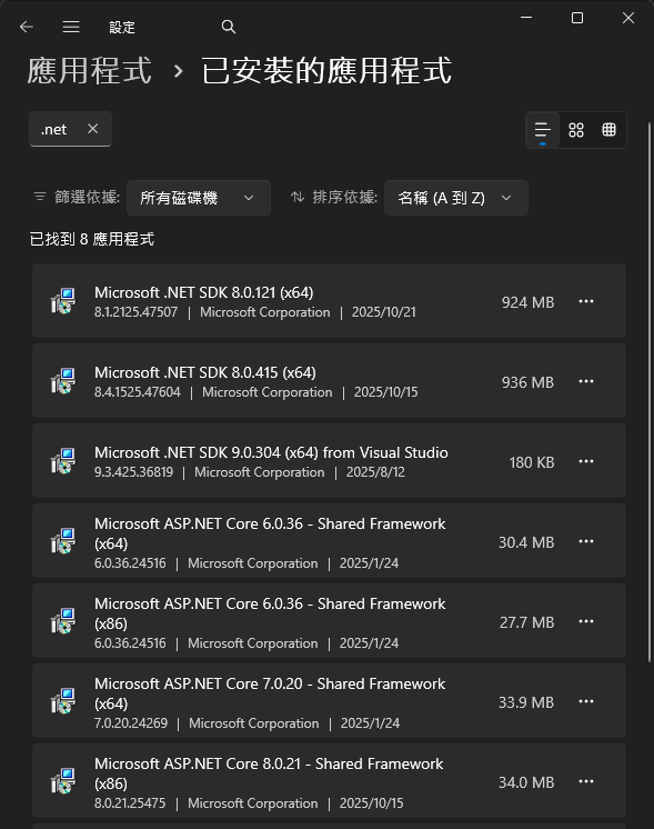 趁著升級,順手整理主機安裝的 .NET 版本。隨著 .NET 版本更新,我一路裝了 .NET 6/7/8/9,應用程式清單一堆:(註:我之前沒學明白,其實裝了 SDK 就不用裝 ASP.NET Core 執行階段、.NET 桌面執行階段)