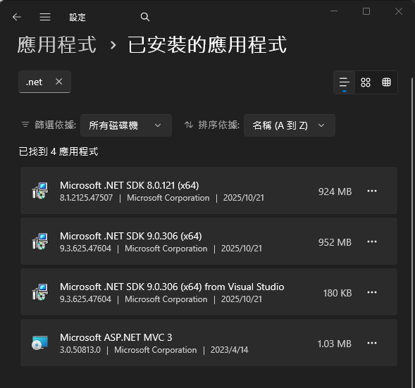 總之,一番清理後我只留了 .NET 8.0.21 (.NET SDK 8.0.121) 跟 .NET 9.0.10 (.NET SDK 9.0.306) 兩種 SDK:(註:原本的 .NET SDK 9.0.304 跟 Visual Studio 2022 有依賴關係,升級 VS2022 時會一併更新到 9.0.306)