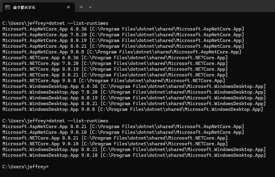 用 dotnet --list-runtimes 檢查,整理後只留 8.0.21 跟 9.0.10,清爽多了。