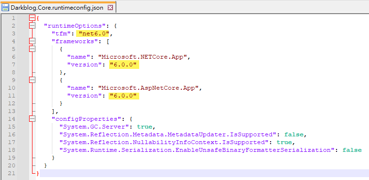要改變執行 Runtime 版本可修改 <組件名稱>.runtimeconfig.json,把其中的 6.0 改成 8.0: