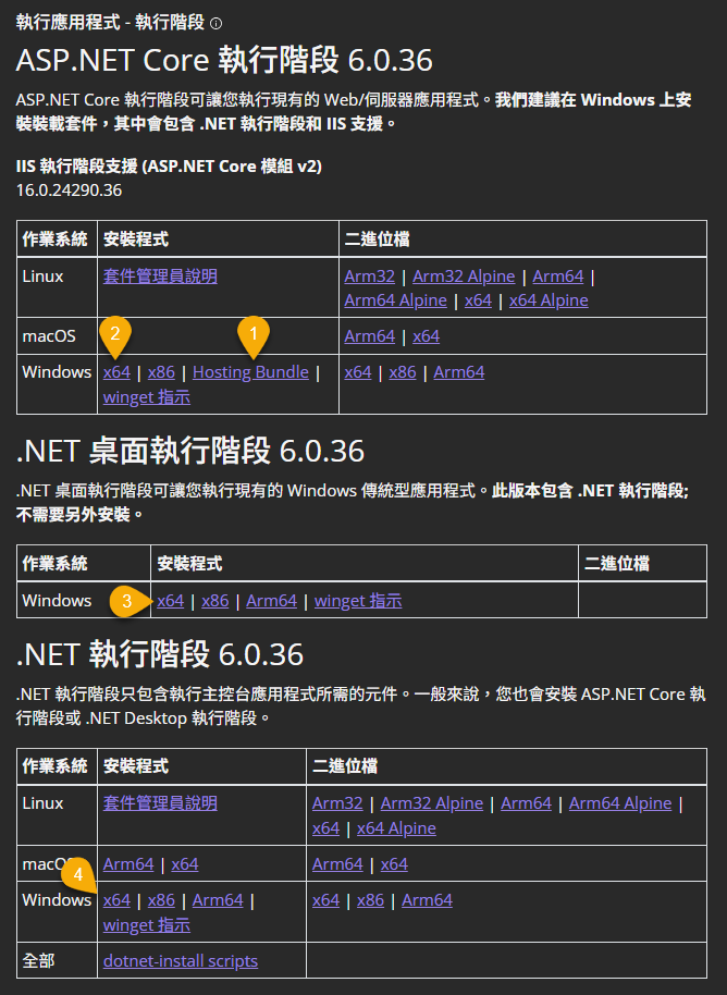 若你是要跑 ASP.NET Core,建議安裝 Hosting Bundle [1] (在應用程式安裝清單的名字叫 .NET X.X Windows Server Hosting),它除了 ASP.NET Core Runtime,還包含 IIS 的 ASP.NET Core 模組 (ANCM),用 IIS 跑 ASP.NET Core 必備。如果非常確定不會用 IIS 跑 ASP.NET Core,可以下載純 ASP.NET Core Runtime [2];若要跑 .NET 6+ 寫的 Windows Form/WPF,則可下載 .NET 桌面執行階段 [3];若很確定只會跑 .NET Console 程式,下載 .NET Runtime 就好 [4]。(註:ASP.NET Core 或 桌面 Runtime 內含 .NET Runtime)
