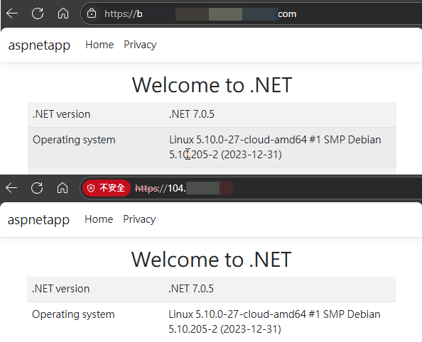 Ngnix 預設將第一個 443 server 區塊視為預設的 443 server 區塊,由於我只有定義一個 server 區塊給 ASP.NET Core,區塊。當接收到使用 IP 的 URL 時,會落入第 5 種狀況,因此被導向 ASP.NET Core Docker。