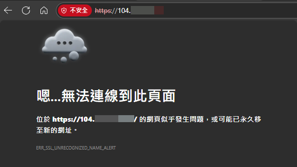 調整完成後,再試著用 IP 連上網站會被無情拒絕,得到 ERR_SSL_UNRECOGNIZED_NAME_ALERT,無法在獲取任何內容,也無法由 TLS 憑證偷窺 DNS 名稱: