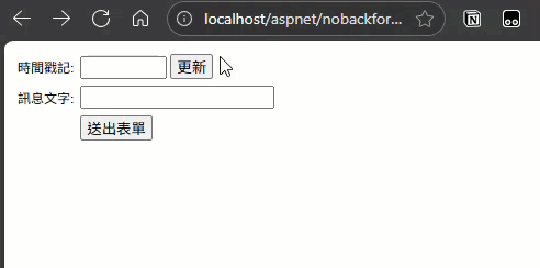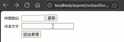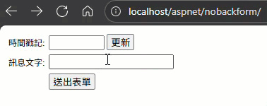 我寫了一個範例網頁重現問題,頁面使用經典的 TextBox、Button WebControl 輸入及控制,按鈕動作也遵循古法由 C# btnXXX_Click 事件處理。網頁有一個時間戳、一個訊息文字欄位,送出的訊息簡單保存在靜態 List<string>,並在送出表單後顯示。(資安提醒:範例為展示用途,省略實務應用該有的身分識別、權限檢查及 CSRF 防護)