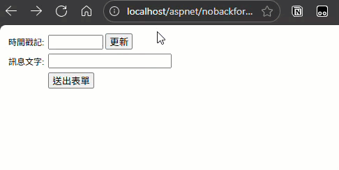 問題情境發生於使用者按【更新】產生新的時間戳記並填入訊息,送出後按回上頁,改了訊息用相同時間戳記送出第二筆時間戳記相同的內容: