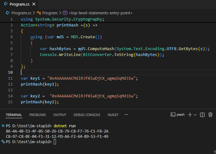 沮喪之餘找 AI 聊天,AI 直言,最有可能的狀況就是 Key 錯了,請我仔細檢查,但拎杯甚至 F5 Debug 進去看變數,已經看兩三遍了還會錯嗎?直到 AI 回答有個建議,請我用 Hash 檢查以免中間藏了什麼不可見字元。抱著死馬當活馬醫試了一下,發現: