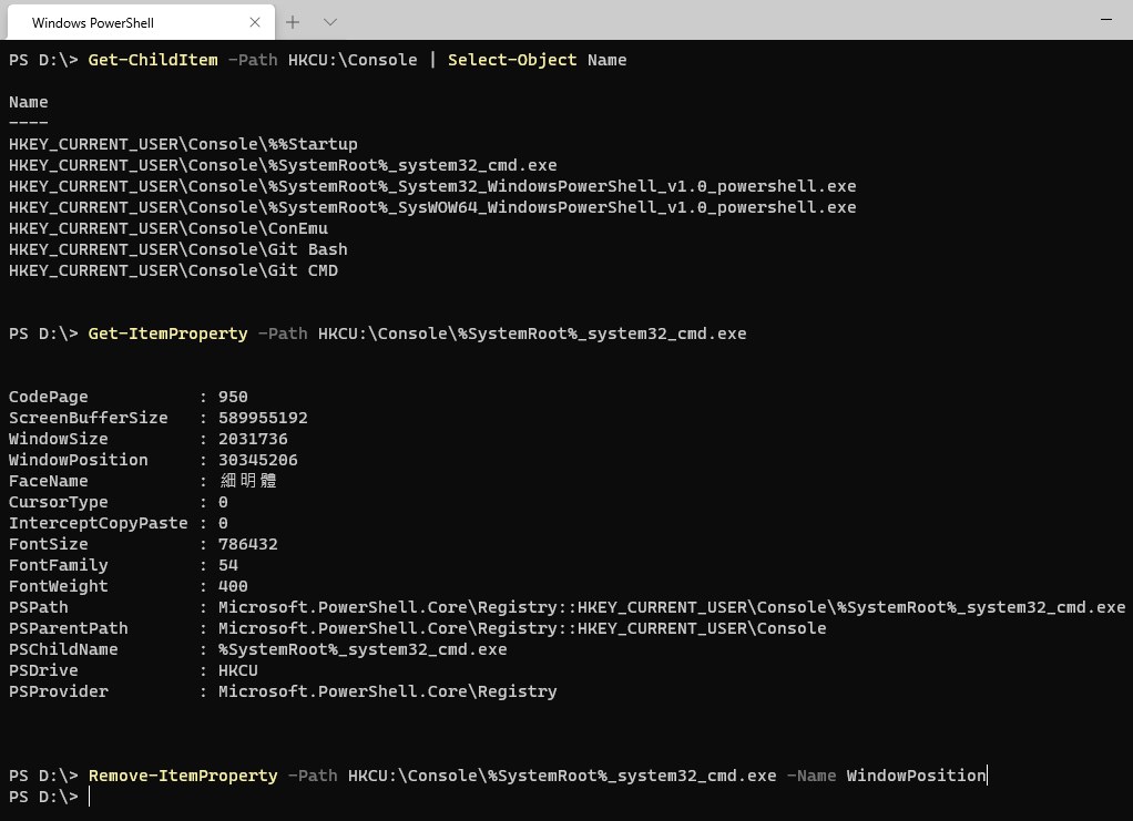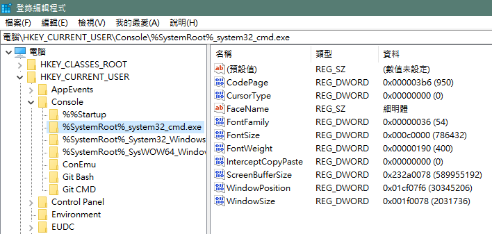 爬文找到 CMD 存視窗座標及大小的 Registry 位置,在 HKCU:\Console 下,cmd.exe、Git Bash、Git CMD 各有自己的設定: