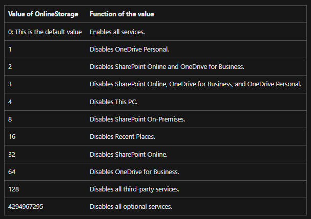 設為 0 時停用 Office 365 設定服務,強制 Outlook 僅依賴本地 Exchange 伺服器進行配置。(企業 DNS 需配合加入設定) - OnlineStorage