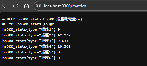 /metrics 的資料格式一望便知,其中定義了名為 hs300_stats 的 Gauge (儀表,會上下波動的度量數字) ,而這個 Gauge 包含了六種資料,插座 1 到插座 6,每次存取時會顯示各插座的耗電量(以瓦為單位)。