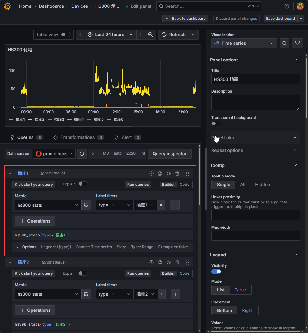 設定妥當後,在 Granfana 新增一個 Dashboard,指定接入 hs300_stats 資料,透過 Label Filter 指定 type = '插座1' 到 '插座6' 新增六個 Query,得到六個插座瓦數的折線圖: