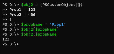 - 要用字串變數當屬性名稱的寫法為 $custObject.$propName (不是 $custObject[$propName]):